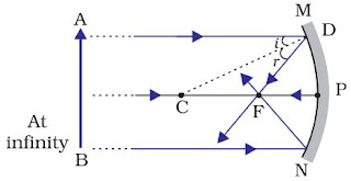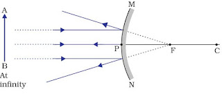 → Focus (F): The point on principal axis where all the parallel light rays actually meet or appear to meet after reflection.