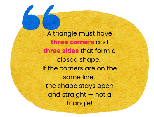 A triangle is a shape with three straight sides and three corners (vertices), where the sides connect to form a closed shape.