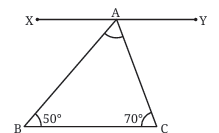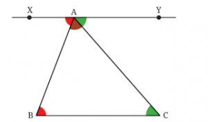 In the example, the line XYXY is parallel to the base of the triangle BCBC, and by using alternate angles, we can prove that the sum of the angles in a triangle is always 180°.
