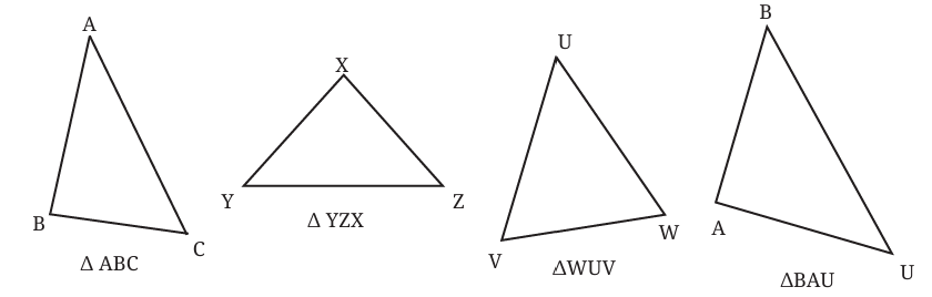 We usually name triangles using their vertices. For example, if a triangle has vertices labeled A, B, and C, we call it âABC. The symbol â is shorthand for "triangle".