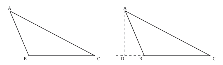 - In obtuse triangles (one angle greater than 90°), altitudes might need to be extended outside the triangle, as seen in the figure given below. This is shown by extending the side BC and drawing a perpendicular from AA to this extended line.