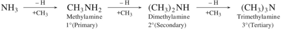 Alkyl or aryl derivatives of ammonia are regarded as amines. These are obtained by replacing one or more hydrogen atoms by alkyl or aryl groups. Amines are classified as primary, secondary or tertiary depending upon whether one, two or three atoms of hydrogen have been replaced by alkyl or aryl groups.