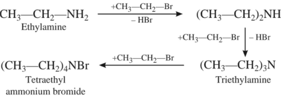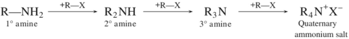 If alkyl halide is in excess, the amine formed further reacts with alkyl halide to form 2°, 3° amines and finally quaternary ammonium salts.