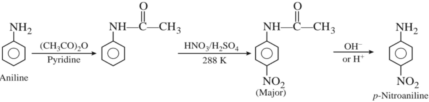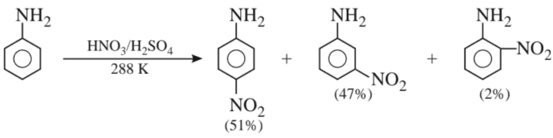 In strongly acidic medium, significant amount of meta isomer is obtained. This is due to the formation of anilinium ion which is meta directing. However, the p – nitro derivative can be obtained as the major product by protecting the –NH2 group by acetylation reaction.