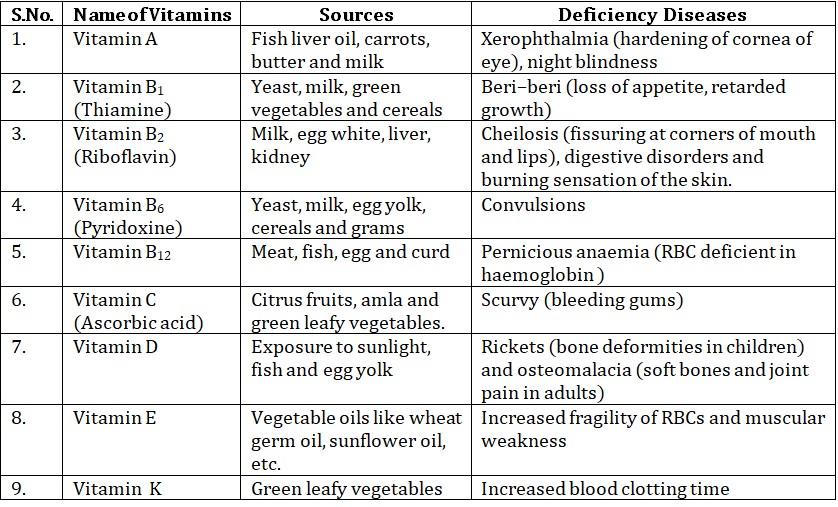Some Important Vitamins, their Sources and their Deficiency Diseases