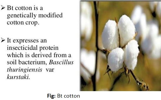 Bt cotton: Bacillus thuringiensis produces certain proteins that can kill insects such as lepidopterans, coleopterans, and dipterans. They produce insecticidal protein, which when enter the body of the insect will become active. This toxin when binds to the midgut produces causes cell to swell and eventually death of the insect. These Bt genes are isolated and inserted into cotton plants. Such cotton is known as Bt cotton. The gene that codes for insecticidal protein is known as cryIAc and cryIIAc.
