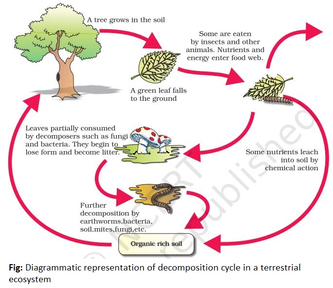 Decomposition: Break down of complex organic matter into simpler inorganic substances like carbon dioxide, water and nutrients by the action of decomposers.