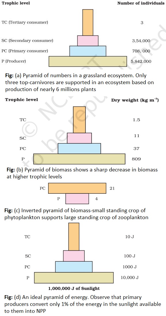 • Pyramids of number and biomass can be inverted in some cases but the pyramid of energy is always upright. This is because when energy flows from one level to another some amount of energy is always lost as heat.