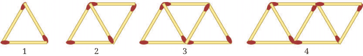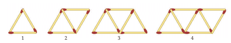 You are given a series of patterns made by arranging triangles using matchsticks. Each triangle shares a side with the next one.