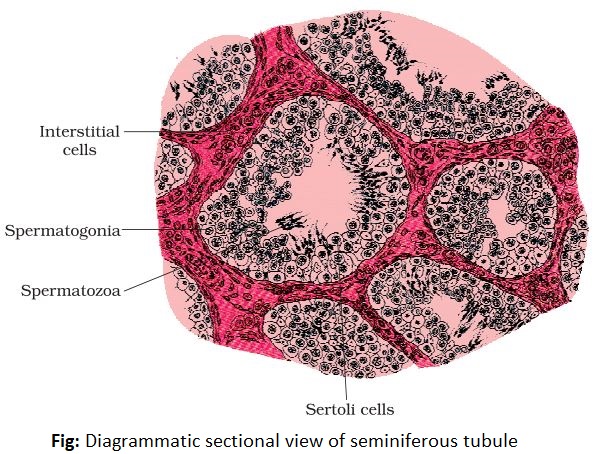 - Interstitial spaces: These are the regions outside the seminiferous tubules. They contain small blood vessels, some immunocompetent cells and interstitial cells or the Leydig cells.