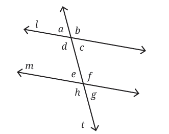 We have two lines l and m cut by a third line t (this third line is called a transversal).
