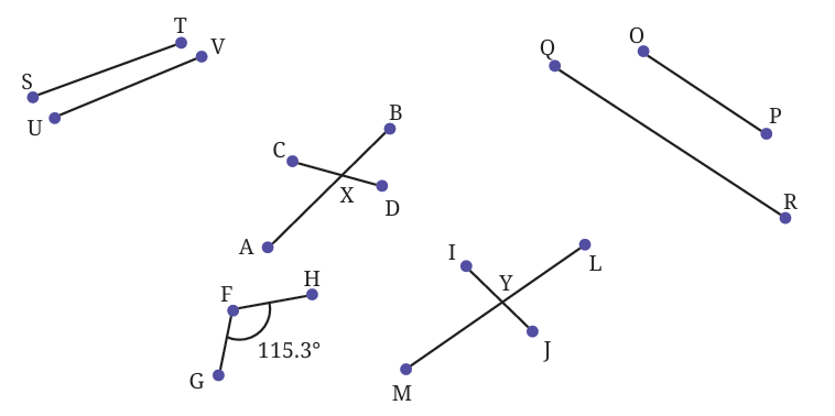Some lines meet or intersect (like FG and FH meeting at F). But what about lines ST and UV? Or OP and QR? If you imagine extending them forever, would they ever meet?