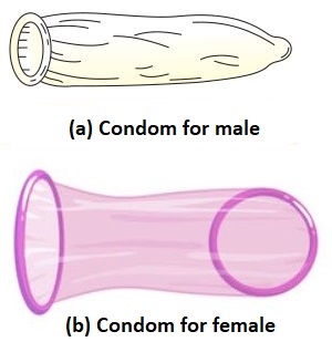 • Condoms: Barriers made of thin rubber or latex sheath that cover the penis in males and the cervix in females. Both male and female condoms are disposable.