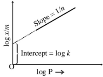(c) At intermediate pressure : x/m will depend upon the power of pressure which lies between 0 and 1 i.e., x/m ∝ P1/n where n > 1 or x/m = kP1/n ….(i)