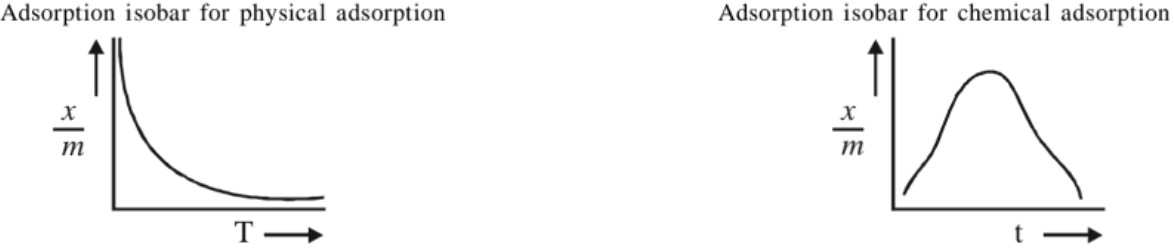 (e) Temperature : Adsorption is accompanied by evolution of heat i.e., ∆H is negative, so the rate of adsorption should decrease with rise in temperature. It is found to be so in case of physical adsorption. The effect of temperature is represented by an adsorption isobar.
