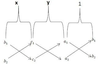 Multiply the co-efficient according to the arrow heads and subtract the upward product from the downward product. Place the three differences under x, y and 1 respectively forming three fractions; connect them by two signs of equality.